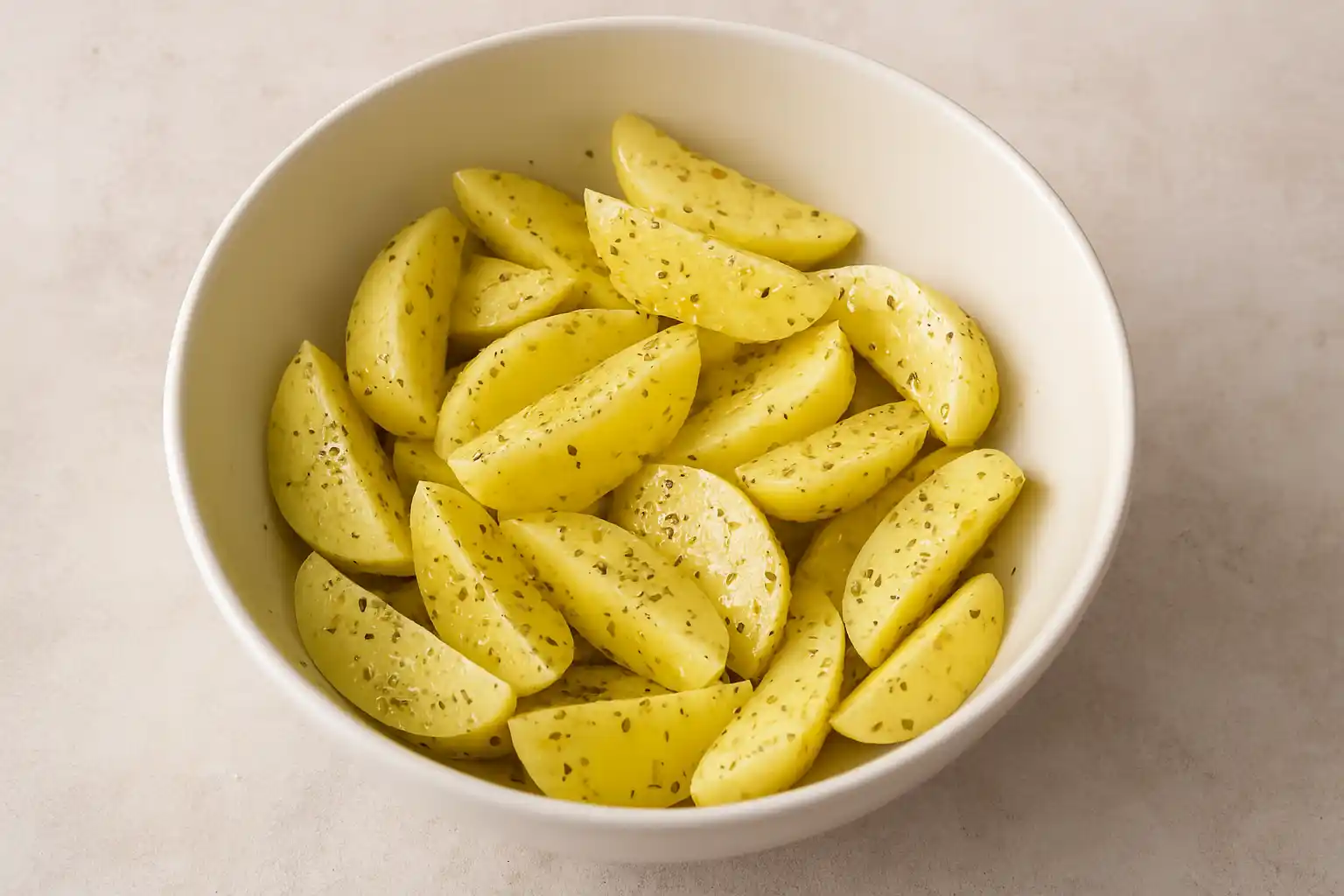 - Sbuccia le patate, tagliale a spicchi regolari e mettile in una ciotola: condiscile con olio, sale, pepe e origano, poi mescola bene per farle insaporire.