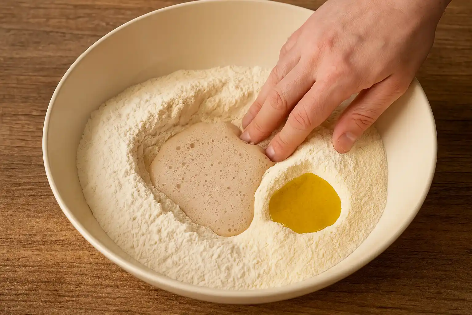 - Impastare dal centro verso l'internoOra che i liquidi sono entrati nelle farine, inizia a mescolare con una forchetta o con la mano, partendo dal centro e portando gradualmente la farina verso l’interno, in modo che si assorba piano piano. All’inizio otterrai un composto piuttosto grezzo e appiccicoso, ma non ti preoccupare: è il passaggio giusto.Quando vedi che l’impasto prende consistenza, trasferiscilo sul piano di lavoro leggermente infarinato. Qui inizia la parte più bella: impastare a mano. Con i palmi spingi l’impasto in avanti e poi ripiegalo su se stesso, giralo di un quarto e ripeti. Continua così per circa 8-10 minuti, fino a quando diventerà liscio, morbido ed elastico.Se lo senti troppo umido e appiccicoso, spolvera appena un po’ di farina; se invece ti sembra duro e asciutto, bagna leggermente le mani con acqua tiepida e riprendi a lavorarlo. L’impasto giusto dev’essere compatto, ma soffice al tatto e con una superficie liscia che non si attacca più alle dita.A questo punto forma una palla e rimettila nella ciotola leggermente unta con olio, pronta per la lievitazione. Copri con pellicola o con un canovaccio umido e lasciala riposare in un luogo tiepido, lontano da correnti d’aria, fino al raddoppio del volume: ci vorrà circa 1 ora.