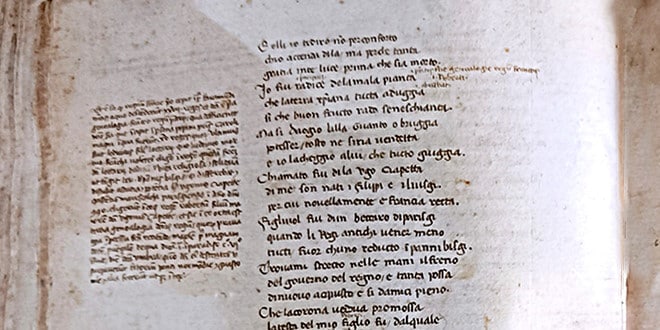 Ciò che, invece, rende prezioso il Codice 512 della Biblioteca di Montecassino ai miei occhi di studioso e di divulgatore pop del poema dantesco, attento alle contaminazioni tra la tradizione letteraria classica e i codici espressivi dei linguaggi social dei nostri tempi, sono alcuni disegni collocati a margine dei fogli, che riproducono particolari contrassegni, talora bizzarri, ma sempre espressivi, riproducenti piccole teste umane o di animali, oggetti varii. Si tratta di notabilia marginali, che accompagnano sentenze (quasi sempre morali, ovvero di carattere parenetico, esortativo) del testo dantesco. Dal mio punto di vista, di interprete postmoderno del testo di Dante Alighieri, questi disegnini (a volte, poco più che scarabocchi) corrisponderebbero agli odierni emoticon, cioè a quel particolare linguaggio visivo dei nostri messaggi Whatsapp. Lo stesso Dante, nel canto X del Purgatorio, aveva scritto della potenza comunicativa del «visibile parlare» (v. 95), alludendo alle immagini che, in compagnia di Virgilio, ammirava lungo la parete della montagna purgatoriale, che riuscivano, cioè, a parlare, a esprimere un concetto, non utilizzando la parola, ma con la sola forza evocativa del disegno, del tratto visivo. Tornando al manoscritto cassinese, annota l’Arciabate Donato Ogliari, che questi contrassegni sono l’evidente testimonianza di una fruizione attiva e spirituale del testo dantesco da parte dei lettori del manoscritto.