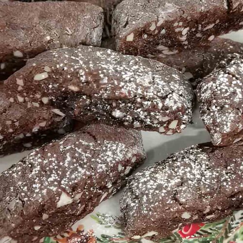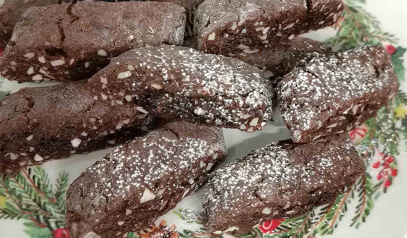 - Impastare il tutto con l’ammoniaca per dolci sciolta in acqua fino ad ottenere un composto solido. Aggiungiamo le mandorle tritate, la scorza grattugiata di un arancia e di un limone, il cioccolato fuso.